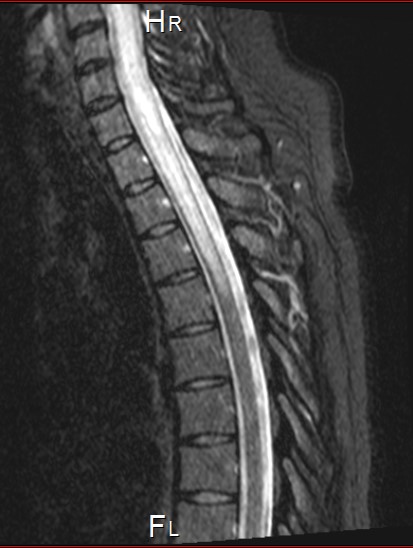 MRI studies were conducted and the local radiologist reading the MRI concluded the patient had findings consistent with a primary cord tumor (ependymoma, astrocytoma, or ganglioma). Other considerations such as hemangioblastoma, intramedullary metastasis or lymphoma were also possible. Intramedullary enhancement within the cord was C3 to T1 with cord expansion (C6-T1)) and extensive surrounding edema extending to T4. (see Figures 3 and 4).